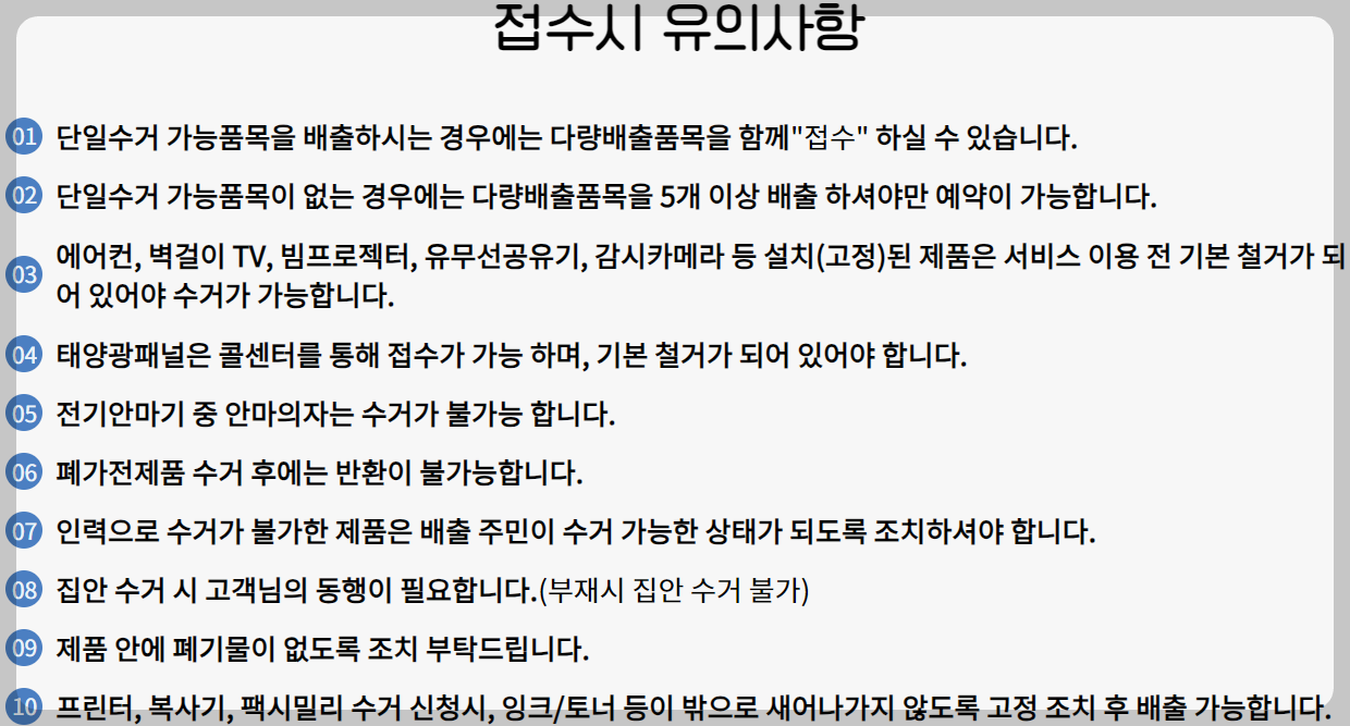 - 사전에 배출 가능 요일을 확인하지 않으면 수거가 지연될 수 있습니다.