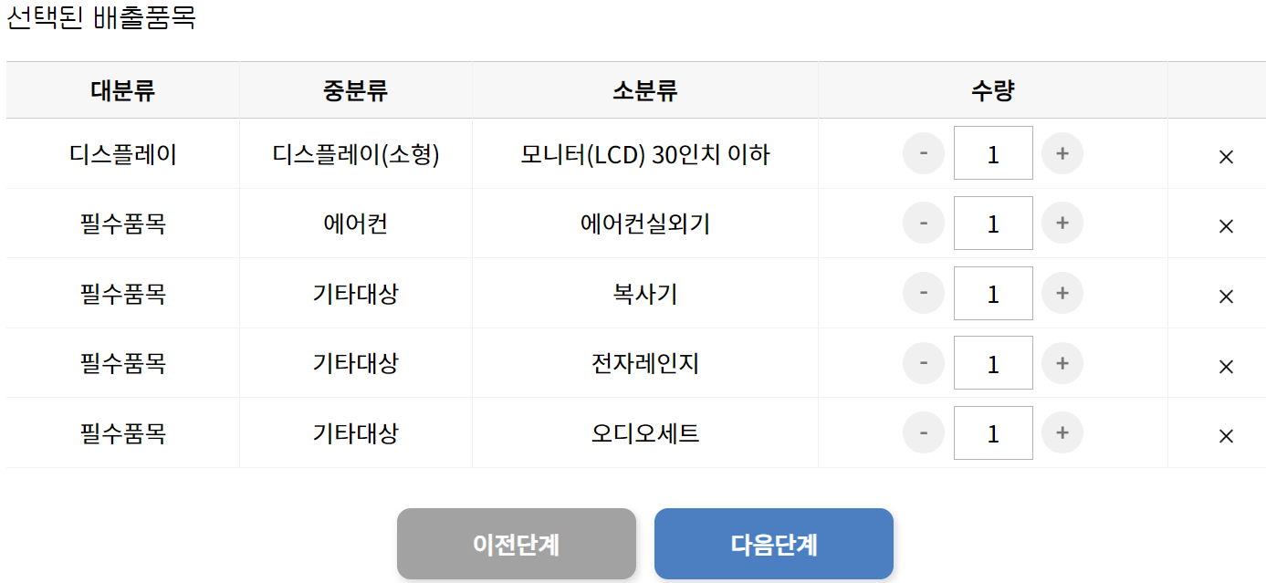 위 사진은 온라인 대형폐기물 배출 시스템인 여기로에서 배출품목을 선택하는 과정입니다.