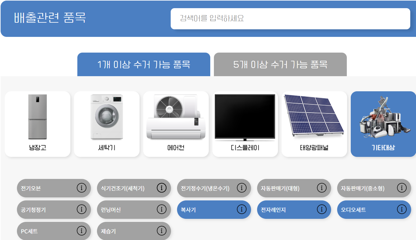 - TV, 냉장고, 세탁기 등 대형 가전제품은 한국전자제품자원순환공제조합의 무상 배출 서비스를 이용할 수 있습니다.