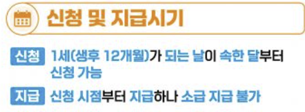 - 지급 시작 시점: 아이가 생후 12개월이 되는 달부터 지급
