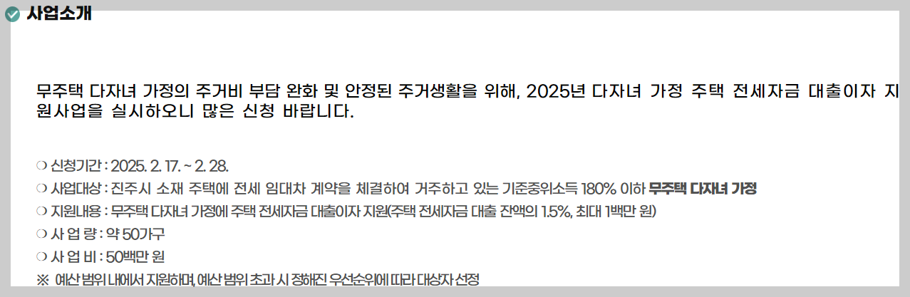 진주시가 다자녀 가정의 주거 부담을 덜어주기 위해 ‘2025년 다자녀 가정 주택 전세자금 대출이자 지원사업’을 시행합니다.