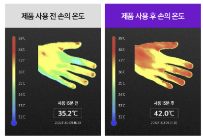 - 온열 기능 탑재: 온열 필름이 손 전체를 감싸며 혈액순환과 근육 이완에 도움을 줍니다.