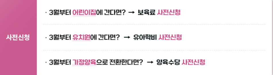 ※ 3월부터 어린이집·유치원 입학 또는 가정양육으로 전환하는 경우, 반드시 2월 28일까지 사전 신청해야 합니다.